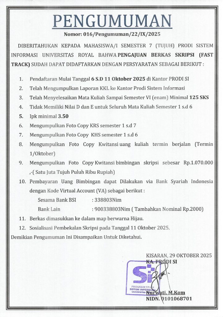 DIBERITAHUKAN KEPADA MAHASISWA/I SEMESTER 7 (TUJUH) PRODI SISTEM INFORMASI UNIVERSITAS ROYAL BAHWA PENGAJUAN BERKAS SKRIPSI (FAST TRACK) SUDAH DAPAT DIDAFTARKAN DENGAN PERSYARATAN SEBAGAI BERIKUT :