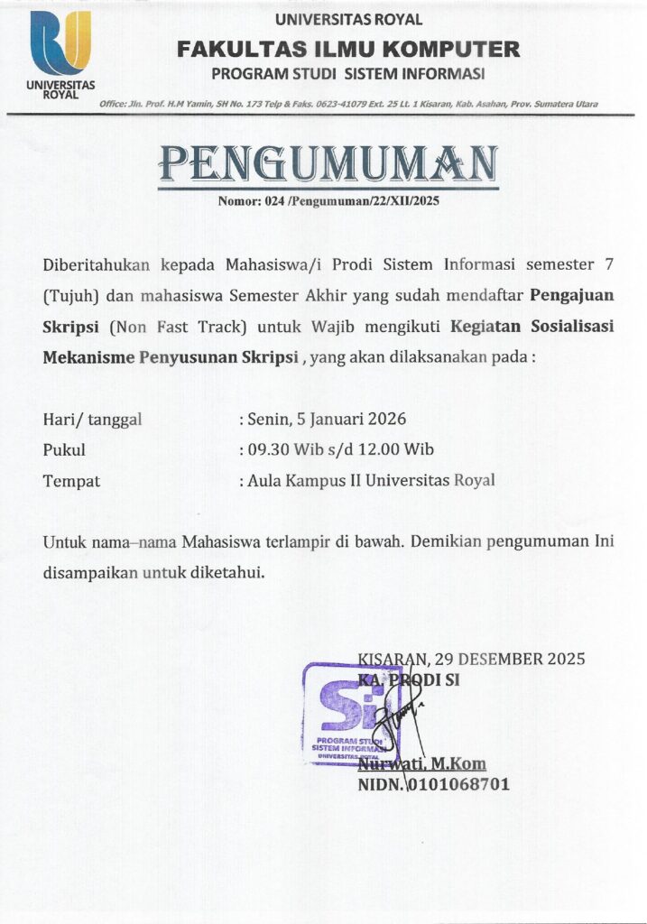 Diberitahukan kepada Mahasiswa/i Prodi Sistem Informasi semester 7 (Tujuh) dan mahasiswa Semester Akhir yang sudah mendaftar Pengajuan Skripsi (Non Fast Track) untuk Wajib mengikuti Kegiatan Sosialisasi Mekanisme Penyusunan Skripsi , yang akan dilaksanakan pada :