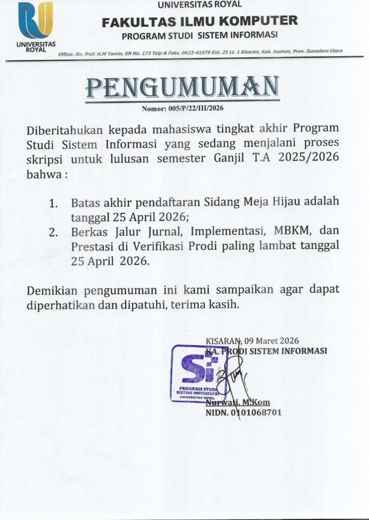 Diberitahukan kepada mahasiswa tingkat akhir Program Studi Sistem Informasi yang sedang menjalani proses skripsi untuk lulusan semester Ganjil T.A 2025/2026 bahwa :