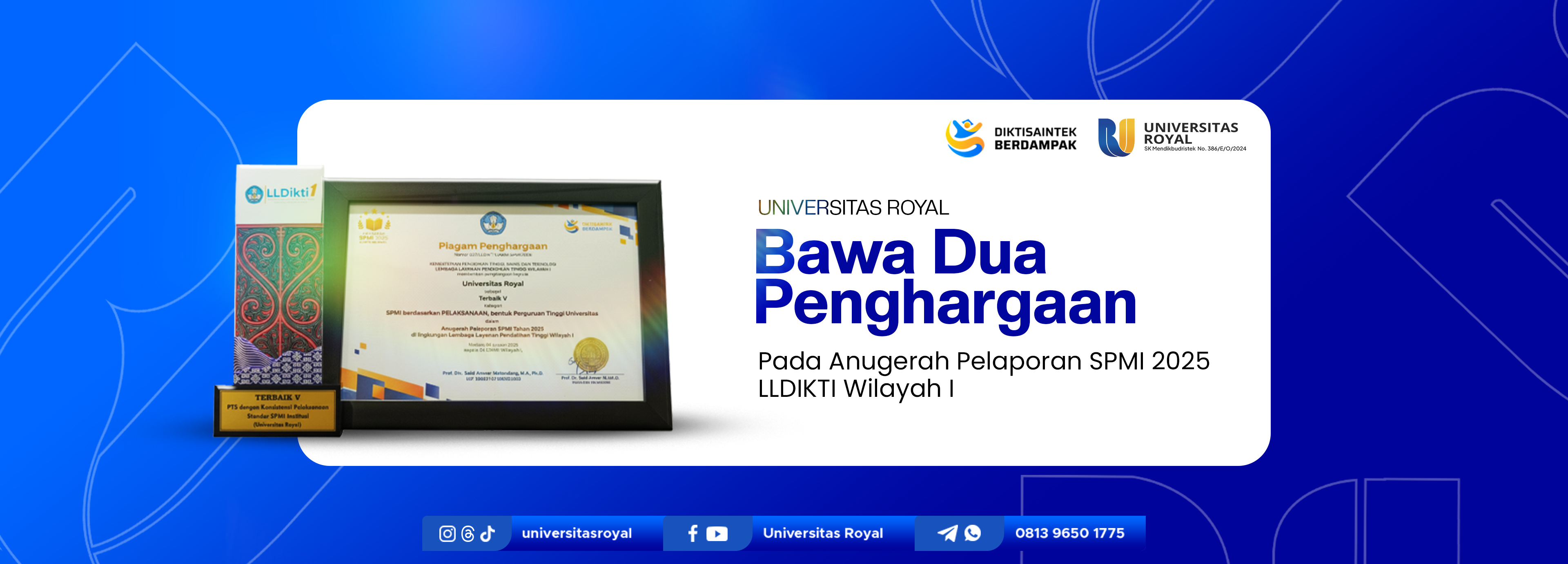 Universitas Royal kembali menorehkan prestasi membanggakan dengan meraih dua penghargaan pada ajang Anugerah Pelaporan Sistem Penjaminan Mutu Internal (SPMI) Tahun
