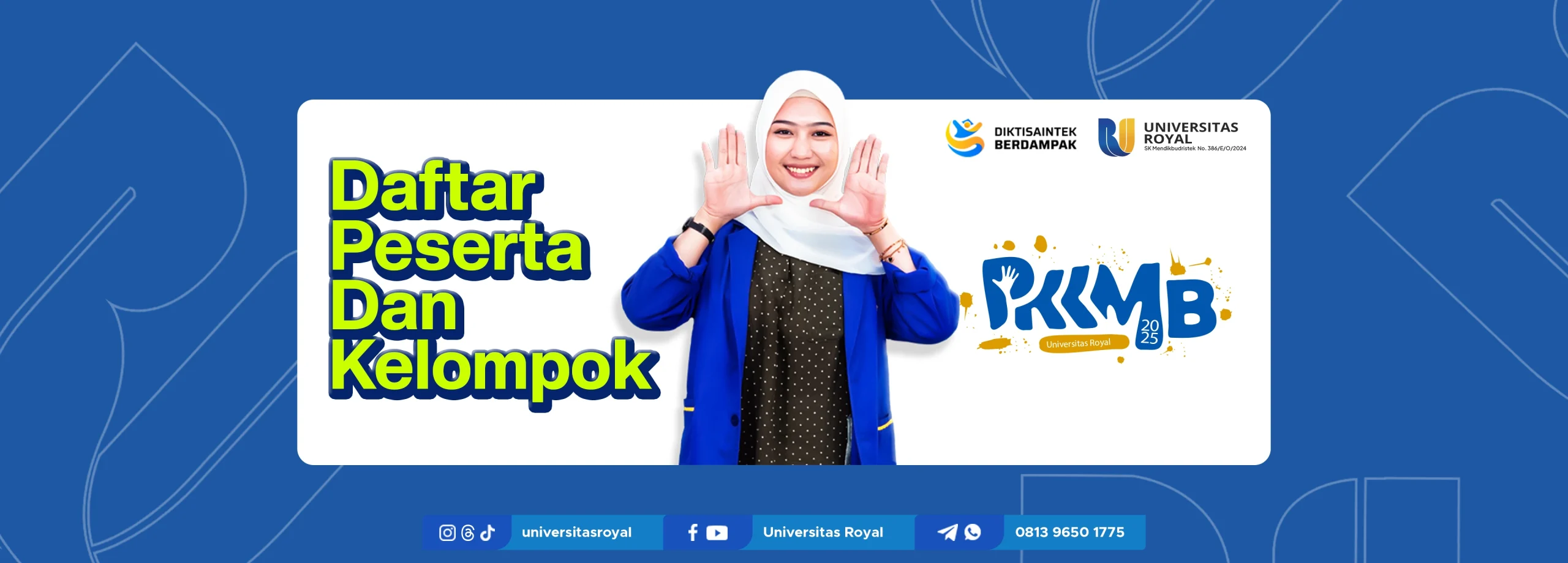 YANG BELUM BUAT TWIBBON UNTUK NAMETAG DAPAT SILAHKAN KUNJUNGI LINK TWIBBONNYA DISINI !http://universitasroyal.ac.id/nametag-peserta-pkkmb-universitas-royal-tahun-2025/ BERIKUT DAFTAR PESERTA DAN KELOMPOK PKKMB UNIVERSITAS